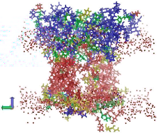 The obtained structure was used for building an input structure for molecular dynamics (MD) simulation by CHARMM-GUI Simulation Input Generator https://charmm-gui.org/ (accessed on 4 June 2023) []. A bilayer membrane composed of phosphatidylglycerol, 1,2-oleyl-sn-glycero-3-phospho-(1′-sn-glycerol) (PG), was simulated by the Membrane Builder []. The protein was inserted into the membrane and the membrane-protein system was surrounded by water molecules and ions. In total, the system of 75 × 75 × 72 Å3 size contained a protein, 149 lipid molecules, 6486 water molecules (TIP3P model) and 195 ions (K+ and Cl−). The input files for GROMACS were generated by the special module [].