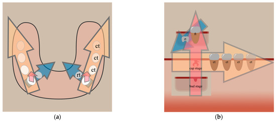 Diagram of the three directions of tooth number regulation. (a) A dorsal diagram of dentition development in three directions in the dental arch; (b) an abstract diagram of three directions of tooth number regulation. Red arrow: the first direction and its further extension refers to the process of a single tooth developing from an early stage of odontogenesis to the final functional tooth. Yellow arrow: the second direction, which is achieved by the addition of a continual tooth distal to the mesial tooth within one dentition. Blue arrow: the third direction, in which the tooth number is maintained by consistent development of a replacement tooth, usually added lingually to the functional tooth. ct: continual tooth; ft: functional tooth; rt: replacement tooth.