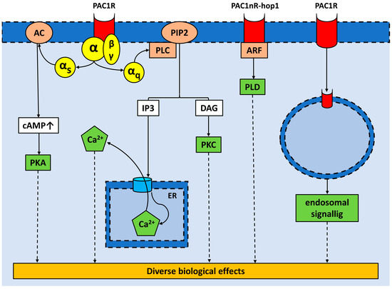 PAC1R-mediated signalling pathways. PAC1R exhibits a preference for coupling with Gαs, resulting in the activation of adenylate cyclase, followed by cyclic adenosine monophosphate production and subsequent activation of protein kinase A and other related downstream signalling pathways. The activation of PAC1R can also stimulate phospholipase C through Gq signalling, resulting in an intracellular calcium level increase and the activation of protein kinase C. Pathways independent from G proteins encompass the activation of phospholipase D and downstream signalling, as well as endosomal signalling pathways. (Abbreviations: AC = adenylate cyclase, ARF = adenosine diphosphate ribosylation factor, cAMP = cyclic adenosine monophosphate, IP3 = 1,4,5–inositol trisphosphate, PAC1R = PACAP type I receptor, PAC1nR-hop1 = PACAP type I receptor splice variant, PIP2 = phosphatidylinositol bisphosphate, PKA = protein kinase A, PKC = protein kinase C, PLC = phospholipase C, PLD = phospholipase D).
