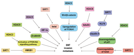 HDACs are also able to regulate cell migration and invasion by regulating the acetylation of their non-histone substrates. The dynamics of microtubules play an important role in ovarian cancer cell migration via affecting the remodeling of the cytoskeleton [96]. HDAC6 can promote ovarian cancer cell motility by deacetylating tubulin [97]. Cortactin, an F-actin-binding protein, also plays important roles in the regulation of cell migration. In ovarian cancer cells, SIRT1 can promote cell migration by deacetylating cortactin [98]. SIRT1 can also activate claudin-5 transcription and maintains the epithelial phenotype of ovarian cancer cells via deacetylating kruppel-like factor 4 [99]. SIRT1 over-expression decreases the expression and acetylation of high-motility group box-1 protein, thus inhibiting ovarian cancer migration, invasion and angiogenesis [100]. β-catenin is the core transcriptional coactivator of the classical Wnt/β-catenin signaling pathway that correlates with the grade, epithelial to mesenchymal transition, chemotherapy resistance, and a poor prognosis in ovarian cancer [101]. The effects of β-catenin on the expression of its target genes depend on its subcellular localization. In non-serous ovarian cancer, HDAC 9 can induce β-catenin translocation to the cytoplasm and decrease the expression of its downstream gene through regulating the acetylation of β-catenin [72]. In addition, up-regulated HDAC5 can promote cell proliferation, migration and invasion by interacting with hypoxia-inducible factor-1α (HIF-1α) and elevating the protein level of HIF-1α [102]. (Figure 1).