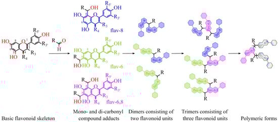 Schematic representation of the proposed mechanism for the condensation of some flavonoids and carbonyl compounds. Some flavonoids for which the formation of the adducts was found: epigallocatechin gallate [,], epicatechin [,], catechin [,], naringenin [], quercetin [,], rutin [,], taxifolin [], kaempferol [,], myricetin [].