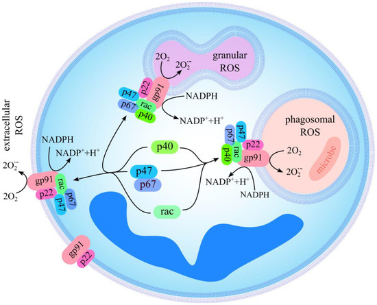 Neutrophils produce ROS via the multisubunit enzyme complex called NADPH oxidase (NOX2) (Figure 2). Two subunits of NOX2, gp91phox and p22phox, are localized mainly in the membrane of specific granules and in the cytoplasmic membrane. Together, they comprise the large heterodimeric subunit flavocytochrome b558 (cyt b558) [,]. In resting neutrophils, the subunits p40phox, p47phox, and p67phox are localized in the cytosol. Upon activation, they, together with Rac-GTPase, are translocated to the membrane and associate with cyt b558 to form active oxidase [,]. The activated complex transfers electrons across the membrane from cytosolic NADPH to O2 to form superoxide anion (O2•−), which spontaneously dismutates to hydrogen peroxide (Figure 2). O2•− and H2O2 can subsequently be transformed into other ROS.