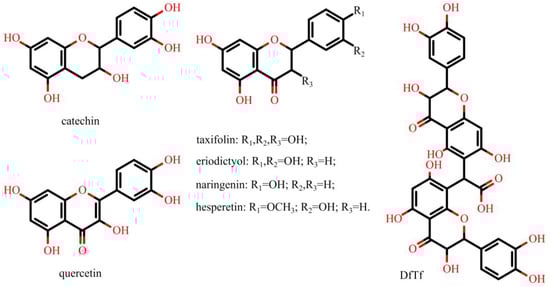 DfTf contains two catechol fragments and exhibits higher hydrogen peroxide- scavenging activity than the parent flavonoid taxifolin and its structural analogs (quercetin, eriodictyol, catechin, hesperetin, and naringenin) [,]. Although the properties of the products of condensation and polymerization of flavonoids remain poorly studied [,,], there is evidence that these compounds exhibit high antioxidant activity, which, in many cases, exceeds that of parent flavonoids [,,,,,]. In particular, the polycondensates of catechin with acetaldehyde and poly(rutin) were shown to exhibit a stronger scavenging activity towards superoxide-anion and stronger inhibitory effects on the peroxidation of human low-density lipoproteins than the monomeric form of flavonoids [,,]. Polymeric quercetin more effectively reduced DPPH radicals than monomeric quercetin []. Oligomerized epigallocatechin gallate (EGCG) exhibited higher superoxide-scavenging activity than its monomeric form []. Proanthocyanidins found in various plants showed potent antioxidant activity, which positively correlated with the degree of their polymerization [,,,]. Adducts formed by polyphenols such as quercetin and propyl gallate with methylglyoxal (mono-and di-MGO quercetin adducts and mono-MGO propyl gallate adduct) retained the ability to scavenge the DPPH radical and carbonyl compounds characteristic of parent flavonoids [,].
