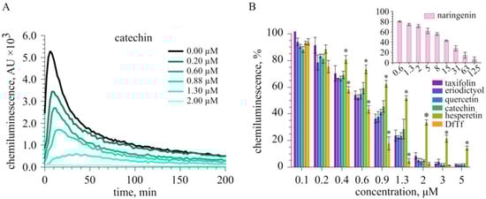Interestingly, taxifolin, eriodictyol, quercetin, and catechin decreased LCL to a greater extent than ICL, and LCL was recorded in the presence of SOD and catalase (Figure 6). This effect was not revealed for hesperetin and naringenin. Moreover, naringenin more effectively inhibited LCL in the presence of SOD and catalase (intracellular CL).