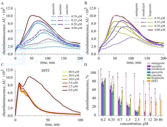 The hydrogen peroxide-scavenging activity of polyphenols was estimated by isoluminol-dependent chemiluminescence (ICL) as described previously []. Briefly, the reaction mixtures contained NaH2PO4/Na2HPO4 buffer (20 mM, pH 7.4), isoluminol (100 µM), HRP (0.25 U), hydrogen peroxide (10 µM), and polyphenols at different concentrations. The concentrations of naringenin were 0.6, 1.3, 2.5, 8.0, 15.0, 31.0, 63.0, and 125 μM. The concentrations of taxifolin, quercetin, catechin, eriodictyol, hesperetin, and DfTf were 0.1, 0.2, 0.4, 0.6, 0.9, 1.3, 2.0, 3.0, and 5.0 μM. Hydrogen peroxide was added to the mixtures immediately prior to the registration of a signal. ICL signals were recorded until ICL returned to the baseline. The integral ICL response was calculated as a sum of ICL values recorded during the measurements. Changes in ICL caused by polyphenols were estimated relative to the control ICL values by the equation: ∫ICL = (∫polyphenol/∫control) × 100%, where ∫ICL is the integral ICL, %; ∫polyphenol is the integral ICL in the presence of polyphenols; ∫control is the integral ICL without the addition of polyphenols. Measurements were carried out on a Tecan Infinite F200 microplate reader (Grödig, Austria) in 96-well plates (Greiner, Kremsmunster, Austria) at 37 °C.