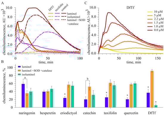 Effect of polyphenols on chemiluminescence of neutrophils stimulated with PMA. (A) The time courses of luminol and isoluminol-dependent chemiluminescence of neutrophils in the control and in the presence of taxifolin and DfTf. The concentration of taxifolin was 1.5 μM, and the concentration of DfTf was 5 μM. (B) Comparison of the effect of polyphenols on total, extra, and intracellular chemiluminescence. The concentration of polyphenols was 1.5 μM, except for the concentration of naringenin and DfTf, which was 20 and 5 μM, respectively. The results were expressed as the mean ± standard deviation. The data were analyzed using one-way ANOVA followed by Tukey’s test. * p < 0.005 compared with other groups (luminol + SOD + catalase; isoluminol); a significant differences between the groups, p < 0.02; b significant differences between the groups, p < 0.005. (C) The time courses of isoluminol-dependent chemiluminescence of neutrophils in the control and in the presence of different concentrations of DfTf.
