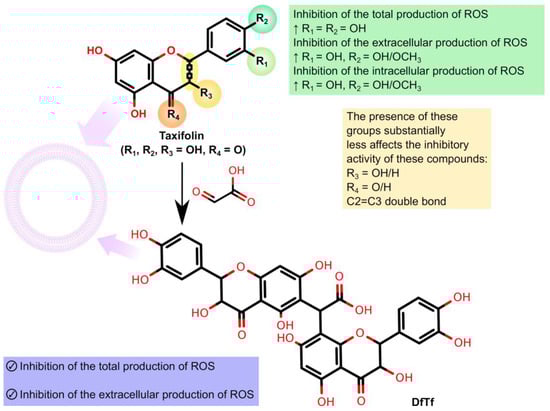 Little has been reported regarding the potential effects of newly formed adducts on the cells of the body. Recently, data indicating that the formation of adducts of rutin with methylglyoxal remarkably reduced the toxicity of this aldehyde in GES-1, HUVEC, and PC-12 cell lines have been published [,]. In turn, the adducts themselves displayed a much lower toxicity, which was comparable with that of rutin []. Here, we estimated for the first time the influence of a conjugate of taxifolin with glyoxylic acid on the level of ROS generated by neutrophils stimulated with PMA and compared the effect of DfTf with that of taxifolin and its structural analogs.