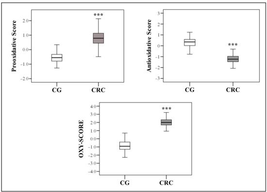 Differences in prooxidative scores, antioxidative scores, and summary OXY-SCOREs between CRC patients and the healthy control group. The box defines the interquartile range (25–75th percentile), the line within the box is the median value, and the whiskers’ ends represent the group’s minimum and maximum values. *** p < 0.001 vs. control group using the Mann–Whitney U test. Abbreviations: CG—control group; CRC—colorectal cancer patients.