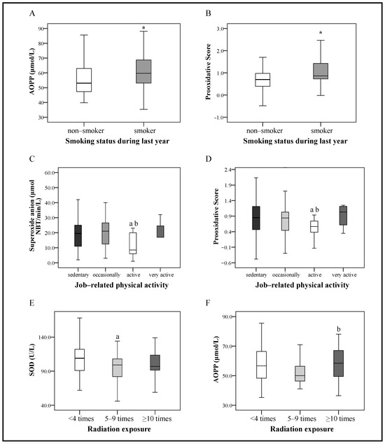 The influence of smoking status during the last year, job-related physical activity, and radiation exposure on measured and calculated parameters of redox status in CRC patients presented as box plots. The box defines the interquartile range (25–75th percentile), the line within the box is the median value, and the whiskers’ ends represent the group’s minimum and maximum values. (A) The influence of smoking status during last year on AOPP concentrations. (B) The influence of smoking status during last year on prooxidative score values. * p < 0.05 vs. non-smokers by Mann–Whitney U test. (C) The influence of job-related physical activity on superoxide anion levels. (D) The influence of job-related physical activity on prooxidative score values. a,b p < 0.05 vs. sedentary and occasional activity, respectively. (E) The influence of radiation exposure on SOD concentrations. (F) The influence of radiation exposure on AOPP concentrations. a,b p < 0.05 vs. <4 times and 5–9 times, respectively, using the Mann–Whitney U test.