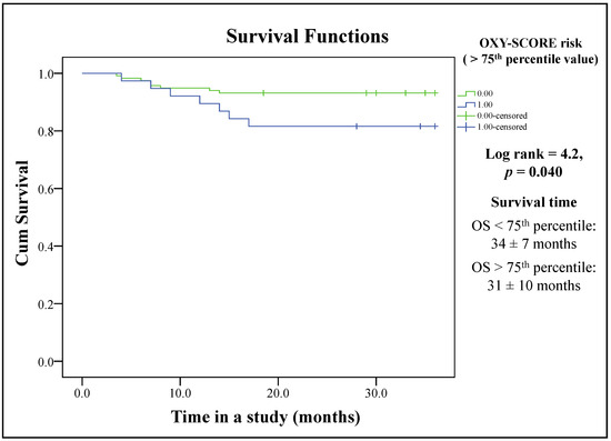 The Kaplan–Meier analysis of the CRC patients’ survival according to OXY-SCORE value risk (>75th OS percentile value). Abbreviations: OS—overall survival.