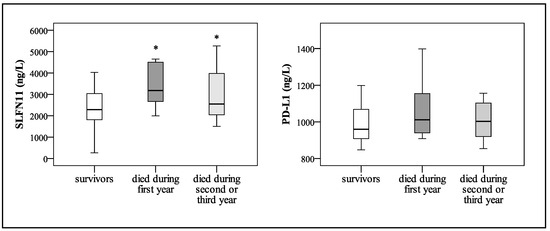The patients who died during the complete study follow-up had significantly higher SLFN11 protein levels (p ≤ 0.05), while the abovementioned redox status parameters and PD-L1 protein levels in the serum did not differ significantly.