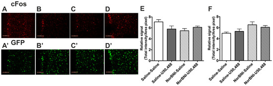 The effect of U50,488 on c-Fos and c-Fos-driven GFP expression in the PFCx of female c-Fos-GFP transgenic mice. (A–D) Representative images showing immunolabelling for c-Fos (A–D) and GFP (A’–D’) following treatment with saline/saline (A,A’), saline/U50,488 (B,B’), norBNI/saline (C,C’), norBNI/ U50,488 (D,D’). Scale bar: 100 μm. (E,F) Quantification of immunolabelling for c-Fos (E) and c-Fos-driven GFP (F) expression. All data are represented as mean ± SEM (n = 6 animals/treatment group).