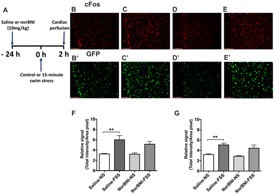 The effect of acute FSS on c-Fos and c-Fos-driven GFP expression in the PFCx of male c-Fos-GFP transgenic mice. (A) Experimental timeline showing administration of norBNI (10 mg/kg, ip), or saline, 24 h prior to 15 min FSS. (B–E) Representative images showing immunolabelling for c-Fos (B–E) and GFP (B’–E’) following treatment with saline/no stress (NS) controls (B,B’), saline/FSS (C,C’), norBNI/ no stress (NS) (D,D’), norBNI/ FSS (E,E’). Scale bar: 100 μm. (F,G) Quantification of immunolabelling for c-Fos (F), and c-Fos-driven GFP (G) expression. All data are represented as mean ± SEM (n = 6 animals/treatment group). One-way ANOVA with post hoc Sidak’s test ** p < 0.01.