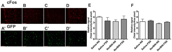 The effect of acute FSS on c-Fos and c-Fos-driven GFP expression in the PFCx of female c-Fos-GFP transgenic mice. (A–D) Representative images showing immunolabelling for c-Fos (A–D) and GFP (A’–D’) following treatment with saline/no stress (NS) controls (A,A’), saline/FSS (B,B’), norBNI/ no stress (NS) (C,C’), norBNI/ FSS (D,D’). Scale bar: 100 μm. (E,F) Quantification of immunolabelling for c-Fos (E), and c-Fos-driven GFP (F) expression. All data are represented as mean ± SEM (n = 6 animals/treatment group).
