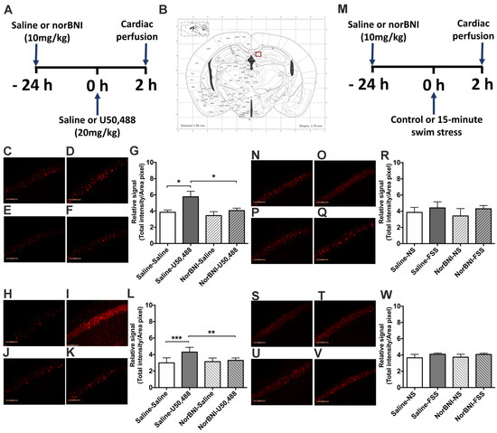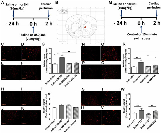 2.5. Effects of Activating KOPr and Acute FSS on c-Fos Expression in the Amygdala