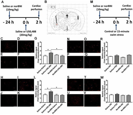 The effect of U50,488 and FSS on c-Fos expression in the CeA of male and female c-Fos-GFP transgenic mice. (A) Experimental timeline showing administration of norBNI (10 mg/kg, ip), or saline, 24 h prior to KOPr activation with U50,488 (20 mg/kg, ip). (B) Schematic coronal section from mouse brain atlas [38] showing region analysed; red square indicates the CeA. Representative images of CeA from male (C–F) and female mice (H–K), showing immunolabelling for c-Fos following treatment with saline/saline (C,H), saline/U50,488 (D,I), norBNI/saline (E,J), norBNI/U50,488 (F,K). Scale bar: 100 μm for all images. Quantification of immunolabelling for c-Fos in male (G) and female (L) sections. (M) Experimental timeline showing administration of norBNI (10 mg/kg, ip), FSS or saline, 24 h prior to 15 min FSS. Representative images of CeA from male (N–Q) and female mice (S–V) showing immunolabelling for c-Fos following treatment with saline/no stress (NS) controls (N,S), saline/FSS (O,T), norBNI/no stress (NS) (P,U), norBNI/FSS (Q,V). Quantification of immunolabelling for c-Fos in male (R) and female (W) sections. All data are represented as mean ± SEM (n = 6 animals/treatment group). One-way ANOVA with post hoc Sidak’s test * p < 0.05.