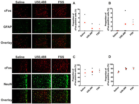 c-Fos is not only expressed in neurons but also in glial cells [39]. Using double immunolabeling with the neuronal marker NeuN (neuronal nuclear protein) and the glial marker GFAP (glial fibrillary acidic protein), in a separate series of experiments, we confirmed that the stimuli used in our study induce c-Fos expression in neuronal cells (Figure 8). In the PFCx of both male and female mice, the proportion of c-Fos positive cells that also expressed GFAP was ≤3% in both the U50,488 and acute stress-treated groups (Figure 8A,B). For example, in 6 stress-treated animals (3× male; 3× female), 203 neurons were c-Fos positive, 3 of which were also positive for GFAP. In these same animals, the proportion of c-Fos positive cells that also expressed NeuN was 68% (male) and 79% (female) in U50,488 treatment groups, 74% (male) and 81% (female) in acute stress treatment groups (Figure 8C,D). Comparable data for c-Fos expression in the NAcc are qualitatively similar (Supplementary Figure S9). Taken together these data show that the vast majority of cells activated by both U50,488 and FSS, in the PFCx and NAcc, are neuronal.