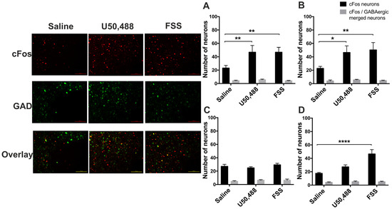 To identify the type of neurons where c-Fos expression is enhanced, following acute stress or KOPr activation, we next used GAD-GFP transgenic mice [40]. In these mice, GFP expression is driven by the glutamic acid decarboxylase (Gad1) promoter, so GFP is expressed only in GABAergic neurons. We confirmed our earlier findings (from c-Fos-GFP mice) that in male PFCx and NAcc both U50,488 and swim stress increased the number of c-Fos-positive cells (Figure 9A,B), whereas in females neither U50,488 nor FSS increased c-Fos expression in the PFCx (Figure 9C) and FSS, but U50,488 did not increase c-Fos expression in the NAcc (Figure 9D). Quantification of the co-localisation of c-Fos and GAD-GFP-expressing neurons in the PFCx and NAcc, of both male and female mice, revealed that there is very little overlap (Figure 9). For example, in PFCx of male mice the number of c-Fos-positive neurons in the saline treatment group was 23 ± 4, rising to 47 ± 8 in the acute stress treatment group. However, the number of neurons dual-labelled for both c-Fos and GAD-driven GFP was 4 ± 1 and 6 ± 1 in control and treatment groups respectively. Thus only 18% and 12% of neurons were labelled for both c-Fos and GAD-driven GFP, with no recruitment of GAD-positive cells following acute stress. Qualitatively similar findings were observed in female mice and also in the NAcc, suggesting that in both male and female mice, in both the PFCx and NAcc, the cells expressing c-Fos are largely non-GABAergic neurons.