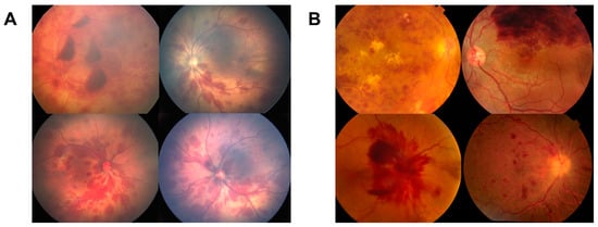 Representative fundus photographs from our pediatric dataset, categorized by diagnosis. This diverse collection includes images dichotomized into trauma cases (A) that encompass vaginal birth trauma (right), and abusive head trauma (left), and medical cases (B), such as ischemic CRVO (top left), coagulopathy (bottom left), BRVO (top right), and CRVO (bottom right).