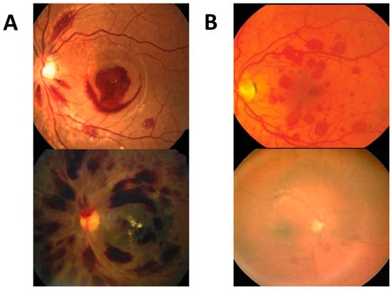 The differential diagnosis of retinal hemorrhages is extensive and includes [3,5] coagulopathy, blood dyscrasia, severe anemia, hemolytic uremic syndrome, endocarditis, vasculitis [2,3], normal birth [6], raised intracranial pressure (ICP), glutaric aciduria type 1, meningitis and Terson syndrome [7]. Retinal hemorrhages can also be diagnostic indicators for severe conditions such as abusive head trauma [1,2,8,9,10,11]. Common causes of retinal hemorrhage in adults include diabetic retinopathy, hypertensive retinopathy, retinal vein occlusion [2,3,12], trauma [9,13], and hematological disorders [2].