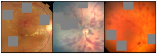 Prior to analysis, all images were subjected to standardized preprocessing procedures in order to ensure uniformity and enhance variability across images from different sources and devices. This involved resizing all images to a consistent shape of 256 × 256 pixels using bilinear interpolation, with zero-padding as necessary. Bilinear interpolation provided a reliable method for resizing images without introducing significant artifacts or distortions. Additionally, each image was normalized per channel based on the mean and standard deviation derived from the ImageNet training set [45]. During the training process, the augmentation steps included resizing the images to 224 × 224 to use transfer learning, applying random contrast ranging from 0.5 to 1.5, introducing Gaussian noise with a kernel size of 11 × 11 and sigma ranging from 0.1 to 2, randomly flipping the images horizontally with a 50% probability, and applying cropping with a scale range of 0.08 to 1. A minimum scale range of 0.08 ensures that even smaller details within the images are considered during training, potentially capturing subtle patterns that may be diagnostically relevant. Furthermore, an additional augmentation technique known as cutout [46], involving the placement of 4 randomly positioned obscuring boxes each measuring 44 × 44 (Figure 3), was employed. The comprehensive combination of these data augmentation methods aimed to prevent overfitting and promote the generalizability of the dataset. During the validation and testing phases, the images were resized to a matrix shape of 224 × 224 and underwent per-channel normalization, mirroring the preprocessing steps implemented during training.
