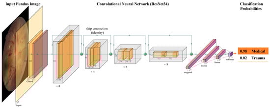 In this study, our focus was the training of CNN and Transformer architectures to effectively discern between retinal hemorrhages of traumatic and medical origins. To achieve this, all experiments are derived from standard ResNet-based architectures [47] (ResNet34 shown in Figure 4), Residual Attention Networks (ResAttNet56) [48] using attention residual learning, a vision Transformer (ViT) image classification model [49], and FastViT [50], a hybrid vision transformer architecture (Table 3). Each model was fine-tuned after initialization with pretrained ImageNet weights from the PyTorch repository (torchvision 0.15.0; IMAGENET1K_V1) [51] for ResNet models and PyTorch Image Models [52,53] for ResAttNet56, ViT-small, and FastViT models.