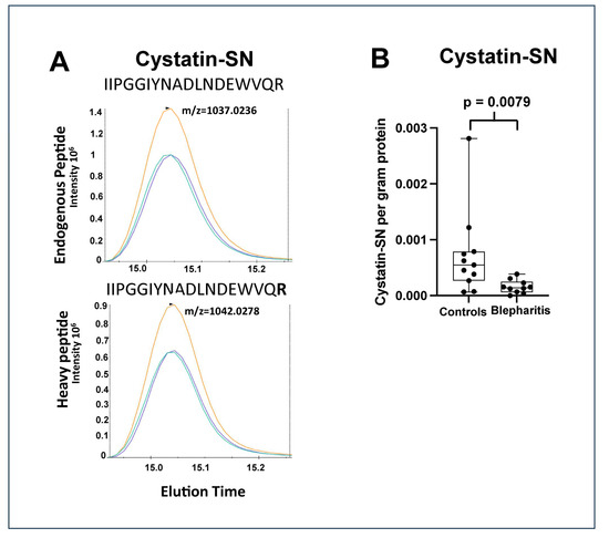 (A) Chromatograms of the peaks obtained by single reaction monitoring analysis of cystatin-SN with added heavy peptide, IIPGGIYNADLNDEWVQR, synthesized with the C-terminal R (bold) containing heavy isotopes (13C6,15N4). Three transitions are shown with different colours from the endogenous peptide at m/z = 1037.0236 (upper panel) and from the heavy peptide at m/z = 1042.0278 (lower panel). (B) Box plot of the amount of cystatin-SN (gram) per gram protein in the healthy and the blepharitis group. Cystatin-SN was downregulated 0.26-fold in the blepharitis group (Mann–Whitney test, p = 0.0079).