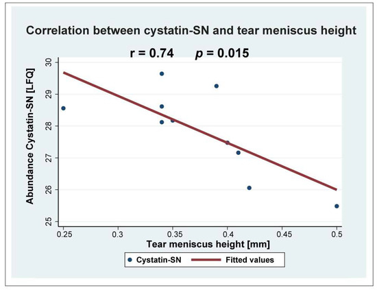 Cystatin-SN correlated negatively with tear meniscus height (r = 0.74; p = 0.015).