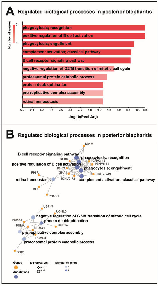 Gene ontology biological processes. (A) MGD was associated with regulation of proteins involved in B cell activation, phagocytosis, and complement activation. MGD was also associated with the regulation of proteins involved in mitotic cell cycle, protein deubiquitination, and proteasomal catabolic processes. (B) Proteins involved in B cell activation, phagocytosis, and complement activation were immunoglobulin components, including immunoglobulin heavy variable 5–51 (IGHV5-51), Ig mu chain C region (IGHM), immunoglobulin lambda constant 3 (IGLC3), immunoglobulin heavy variable 3–15 (IGHV3-15), Ig alpha-1 chain C region (IGHA1), immunoglobulin heavy variable 3–72 (IGHV3-72), immunoglobulin heavy variable 3–49 (IGHV3-49), and Ig kappa chain C region (IGKC). Proteins involved in proteasomal catabolic processes included proteasomal subunits alpha types 1, 5, and 7 and subunit beta type 1 (PSMA1, PSMA5, PSMA7, and PSMB1). Proteins involved in deubiquitination included proteasomal subunits (PSMA1, PSMA5, PSMA7, and PSMB1) and ubiquitin carboxyl-terminal hydrolases 14 (USP14), 47 (USP47), isozyme L3 (UCHL3), and protein DDI1 homolog 2 (DDI1).