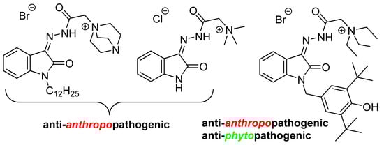 One of the limiting factors in the medical and biological applications of many isatin derivatives is their low water solubility. One approach to solving this problem is based on the introduction of an ammonium moiety. Not only does this positively charged group improve the desired physicochemical characteristics, but it can also expand the range of action of the compounds. This is evidenced by recent reviews on the therapeutic possibilities of various quaternary ammonium compounds [18,19,20,21,22]. Earlier, we also demonstrated the high potential of isatin hydrazones containing a quaternary ammonium center in the search for drug candidates for combating human and plant diseases [23,24,25,26,27] (Figure 2).