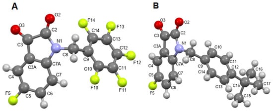 X-ray geometry of fluorinated isatins 3f (A) and 4c (B) in the crystals. Ellipsoids are shown with a 50% probability.