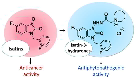 In this work, we approached it from two main angles: for substituted isatins, we evaluated the potential of using these substances as antitumor drugs, and for pyridinium hydrazones, we assessed their prospects as antiphytopathogenic agents (Figure 5).