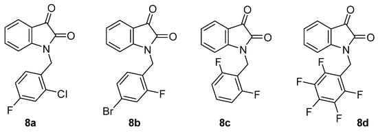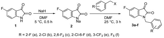 Fluoro-substituted derivatives 3a–f were synthesized by alkylation of 5-fluoro-isatin sodium salt 2 with halogen-containing benzyl halides (Scheme 1). Isatins 3a,c,e,f contained only F-substituents but in different substitution patterns. In addition, we have prepared a mono-chloro isatin 3b and a mixed 2-chloro-6-fluoro derivative 3d in order to assess the contribution of the fluorine atom in the pendant benzene ring to the biological activity.