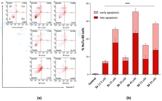 It is well known that tumor cells are able to avoid apoptosis, which leads to uncontrolled, abnormal proliferation and rapid tumor growth. Substances capable of inducing apoptotic death in tumor cells are promising agents in the fight against cancer [50]. Flow cytometry (Guava easyCyte, Merck, Rahway, NJ, USA) showed that the most cytotoxic compounds (3a, 3b, and 3d) were able to induce apoptosis in HuTu-80 cells. Figure 7 shows the apoptotic effects induced by the selected substances at IC50/2 and IC50 cytotoxicity concentrations.