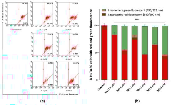 (a) Effects of compounds 3a, 3b, and 3d on mitochondrial membrane potential. (b) Quantitative distribution of HuTu 80 cells in % with red aggregates and green monomers. ****—p < 0.0001 versus control. The statistical analysis was performed using a two-way ANOVA and the Bonferroni test.