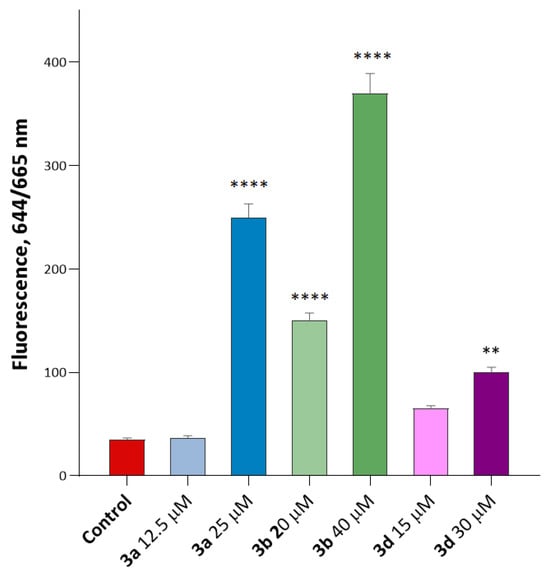 Induction of ROS production by compounds 3a, 3b, and 3d. The data show a significant dose-dependent increase in CellROX® Deep Red fluorescence intensity for compounds 3a and 3b. Interestingly, compound 3a showed only a small (1.1-fold) increase in ROS production at 12.5 µM (below its IC50), but the ROS production increased to 7.1 times relative to the control at 25 µM. This indicates a significant dose-dependent increase in ROS production in the presence of this substance. Other substituted isatins 3b and 3d led to increased ROS production relative to the control. **—p < 0.01 and ****—p < 0.0001 versus control. The statistical analysis was performed using a one-way ANOVA and the Dunnett test.