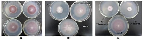 Growth of Fusarium oxysporum IBPPM 543 on agar media fortified with the compounds 7c and 7b (C 20 nmol/mL (a); 5e (C 3 nmol/mL) (b); 5e (C 20 and 30 nmol/mL) (c).