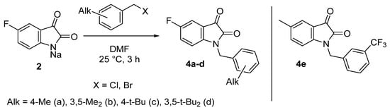To further assess the effect of the position of the fluorine atom and the electronic structure of substituents in the benzyl fragment on the level of antitumor activity, a small series of derivatives 4a–e was obtained by analogy (Scheme 2). In contrast to the reactions described in Scheme 1, the alkylation of sodium salt 2 by less electrophilic benzylic halides requires heating in order to achieve higher yields of the target compounds.