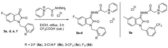 In continuation of our research on the synthesis and biological activity of water-soluble isatin-3-acylhydrazones (for example, see [23,24,25,26]), we also synthesized several new pyridinium acylhydrazones (5a–e) and previously published more lipophilic analogs (7a–c) [26] (Figure 3) containing fluorine atoms in various molecular fragments (Scheme 3).