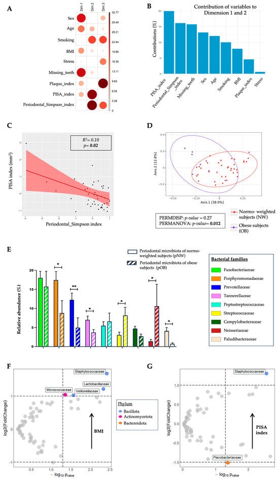 Comparison of periodontal microbiota between obese subjects (OB; n = 11) and normo-weighted subjects (NW; n = 34). (A,B) Principal Component Analysis (PCA) between oral clinical parameters and Periodontal Simpson Index (alpha diversity) with their contribution for each dimension. (C) Pearson’s correlation analysis between PISA index and Periodontal Simpson Index. (D) Unifrac index representation of the beta diversity. (E) Relative abundance (%) for taxonomic family, identified with significant differences in periodontal microbiota between obese and normo-weighted subjects. Data as mean ± SD, * p < 0.05, ** p < 0.01, unpaired Mann–Whitney test. (F) Volcano plot analysis identifying significant changes in bacterial abundance according to increasing BMI. (G) Volcano plot analysis identifying significant changes in bacterial abundance according to increasing PISA index.