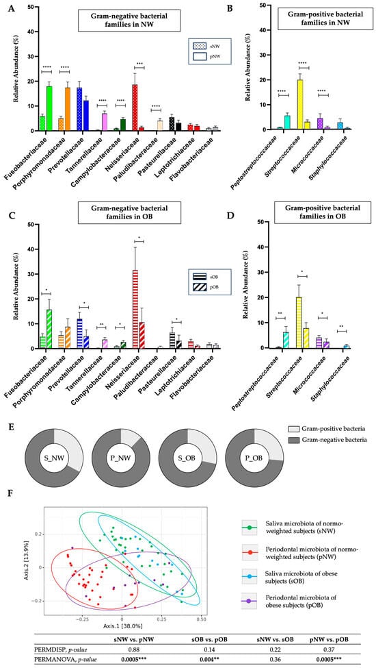 We observed that the relative abundance of Neisseriaceae (18.16% ± 25.45 vs. 1.38% ± 2.97; p = 0.00019), Streptococcaceae (20.32% ± 13.90 vs. 3.00% ± 45.52; p < 0.0001) and Micrococcaceae (4.34% ± 10.29 vs. 0.78% ± 2.58, p > 0.0001) families in salivary microbiota of normo-weighted subjects (sNW) was significantly higher than in periodontal microbiota of normo-weighted subjects (pNW). In contrast, the relative abundance of Fusobacteriaceae (5.86% ± 5.24 vs. 17.99% ± 10.03; p < 0.0001), Porphyromonadaceae (5.46% ± 5.90 vs. 17.44% ± 12.89; p < 0.0001), Peptostreptococcaceae (0.84% ± 0.99 vs. 5.48% ± 6.01; p < 0.0001) and Tannelleraceae (0.31% ± 0.40 vs. 7.00% ± 5.74; p < 0.0001) families was significantly lower in sNW compared to pNW (Figure 2A,B). In obese subjects, we observed that the relative abundance of Prevotellaceae (11.22% ± 8.81 vs. 4.96% ± 8.58; p = 0.047), Neisseriaceae (31.52% ± 30.58 vs. 10.61% ± 19.01, p = 0.016), Streptococcaceae (18.49% ± 17.18 vs. 8.13% ± 7.24, p = 0.04), Pasteurellaceae (5.78% ± 7.21 vs. 3.17% ± 7.49; p = 0.01) and Micrococcaceae (3.76% ± 3.02 vs. 2.69% ± 3.74; p = 0.047) families in saliva microbiota of obese subjects (sOB) was significantly higher than in periodontal microbiota of obese subjects (pOB). Moreover, the relative abundance of Fusobacteriaceae (6.22% ± 7.59 vs. 15.73% ± 13.40; p = 0.034), Peptostreptococcaceae (0.50% ± 0.73 vs. 6.53% ± 7.54; p = 0.0032) and Tannelleraceae (0.20% ± 0.29 vs. 3.64% ± 2.67; p = 0.0004) families was significantly lower in sOB compared to pOB (Figure 2C,D). In addition, the overall distribution of Gram-positive and Gram-negative bacteria within each group was compared (Figure 2E). In normo-weighted subjects with periodontitis, the proportion of Gram-positive bacteria was significantly higher in the salivary microbiota than in the periodontal microbiota (32.94% vs. 12.21%; p = 0.0006). On the other hand, in obese subjects with periodontitis, a similar proportion of Gram-positive bacteria was observed in the salivary and periodontal microbiota (28.27% vs. 26.42%; p = 0.87). The periodontal microbiota of obese subjects had a higher proportion of Gram-positive bacteria than periodontal microbiota of normo-weight subjects (26.42% vs. 12.21%; p = 0.018). The relative abundance of Staphylococcaceae was significantly higher in periodontal microbiota of OB compared to periodontal microbiota of NW subjects (respectively, 1.13% ± 1.69 vs. 0.48% ± 1.99; p = 0.006) (Tables S1 and S2). The relative abundance of Staphylococcaceae was around 4.4-fold less important in the periodontal microbiota than in the salivary microbiota in normo-weight subject. In contrast, no change was observed between both microbiota in obese subjects.