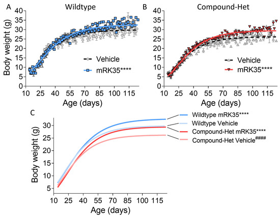mRK35 treatment increases body weights in both wild-type (A) and Compound-Het (B) mice. (C) Growth curves for all groups overlayed. mRK35 increased the body weights of the Compound-Het mice to that of untreated wild-type mice. A Gompertz’s growth curve was used to fit body weights. **** p < 0.0001 indicates significantly different curves vs. vehicle-treated mice of the same genotype. #### p < 0.0001 indicates a significantly different curve vs. vehicle-treated wild-type mice. N-values: WT Vehicle: 14; WT mRK35: 10; Compound-Het Vehicle: 11; Compound-Het mRK: 8.