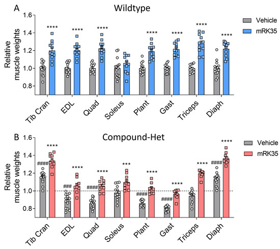 mRK35 treatment resulted in hypertrophy of multiple skeletal muscles in both wild-type (A) and Compound-Het (B) mice. Graphs show the relative change in muscle weights normalized to tibia lengths. The dashed line in B indicates vehicle-treated wild-type mice. Two-way ANOVA with Tukey’s post hoc test was used for statistical testing. *** p < 0.001 and **** p < 0.0001 vs. vehicle-treated mice of the same genotype. ### p < 0.001 and #### p < 0.0001 vs. vehicle-treated wild-type.