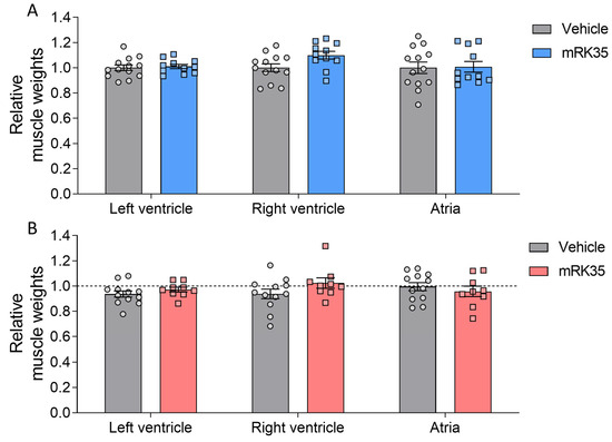 To determine whether the observed greater body mass is accompanied by increased muscle mass, we examined a variety of striated muscle types. Muscle weights were measured and normalized to tibia lengths. Most muscles in Compound-Het mice were atrophic/hypotrophic compared to wild-type mice while tibialis cranialis and diaphragm muscles were hypertrophic (Supplementary Figure S1), as reported before for this model [20]. In wild-type animals, mRK35 significantly increased muscle mass by on average 22%, except for soleus (Figure 2A, relative values shown). The mRK35 treatment of Compound-Hets resulted in ~19% greater weights of all examined compared to vehicle-treated Compound-Hets (Figure 2B, relative values shown; the dotted line indicates untreated wild-type mice). Notably, the treatment with mRK35 in Compound-Het mice either restored muscle weights to the muscle weights of untreated wild-type mice or exceeded that of untreated wild-type mice (Figure 2B). We did not find any effect of mRK35 on the heart chamber weights, in neither wild-types (Figure 3A) or Compound-Hets (Figure 3B). Thus, mRK35 specifically affects skeletal muscle.