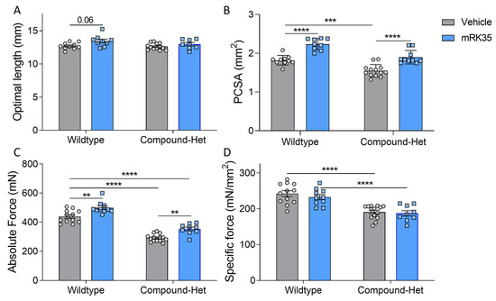 To investigate whether the muscle mass increase after mRK35 treatment was functional, we initially measured in situ plantarflexion force generation using the foot plate system described in Lindqvist et al. [20]. After mRK35 treatment, the hindlimbs of the mice were challenging to correctly position in the setup and the electrodes were difficult to place in proximity to the sciatic nerve due to the increased muscle size. We concluded that the results of these experiments were not reliable. Thus, we decided to perform intact muscle experiments on Extensor Digitorum Longus (EDL) muscles instead. Isolated muscles were lengthened to optimal length, as determined by twitch stimulations. The optimal length of EDL did not differ between genotypes at baseline and statistical testing using 2-way ANOVA revealed a significant treatment effect of mRK35 on optimal length (Figure 5A). However, multiple comparison testing with Tukey’s correction method across all groups showed only a trend (p = 0.06) toward longer optimal length in wild-type mice (Figure 5A). The physiological cross-sectional area, pCSA, of EDL muscle was smaller in Compound-Hets compared to wild-types (Figure 5B). Treatment with mRK35 increased pCSA by 23% and 21% in wild-type and Compound-Het mice, respectively. Notably, the pCSA of mRK35-treated Compound-Het mice were similar to untreated control mice (Figure 5B). The maximal isometric force produced during tetanus was 33% lower in Compound-Hets compared to controls at baseline (Figure 5C). The mRK35 treatment increased tetanic force by 14% and 20% in wild-type mice and Compound-Het mice respectively (Figure 5C). In line with our previous study [20], the specific force (force normalized to pCSA) in untreated mice was decreased by 22% in Compound-Hets compared to wild-types, and no effect of mRK35 was observed on the specific force in neither wild-type nor Compound-Het mice (Figure 5D). We also examined whether mRK35 had any effect on contraction kinetics. Time to half-maximal force normalized to the produced force was unchanged between wild-type and Compound-Hets (Supplementary Figure S3A), while time to half relaxation normalized to force was significantly slower in Compound-Hets compared to wild-type mice (Supplementary Figure S3B). mRK35 had no effect on the kinetics of contraction (Supplementary Figure S3A,B).