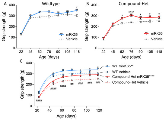 Increased grip strength in mRK35-treated mice. (A) In wild-type mice, mRK35 only increased grip strength at 4 months of life. (B) From two months of life and onwards Compound-Het mice treated with mRK35 displayed greater grip strength. (C) Grip strength for all groups at all time points. Two-way ANOVA with Šídák’s post hoc test was used for statistical testing. In C, grip strength at the plateau of the fitted curves is compared (see methods for details). * p < 0.05, ** p < 0.01, and **** p < 0.0001 vs. vehicle-treated mice of the same genotype. ## p < 0.01, ### p < 0.001, and #### p < 0.0001 for vehicle-treated Compound-Het vs. vehicle-treated wild-type.