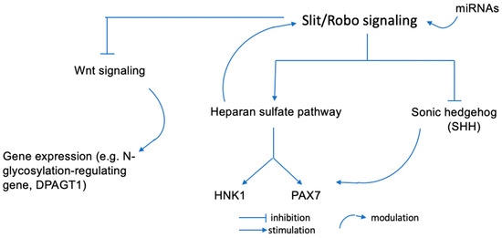 Glycan epitopes, such as HNK1, are involved in the Slit/Robo signaling-mediated proliferation and differentiation of neural tube cells. The Slit/Robo1 pathway controls neuroepithelial cell proliferation and differentiation in a time-dependent manner. Dorsoventral neural tube genes are finely spatiotemporally regulated. According to a study by Wang et al., Robo1 has a substantial effect on several pathways notably for the Sonic hedgehog (SHH) expression in the ventral neural tube and the resulting production of migrating neural crest cells that express HNK1. Anti-HNK1 antibodies specifically inhibit the attachment of cranial neural crest cells to laminin but not collagens I or IV or fibronectin, whereas they inhibit the attachment of trunk neural crest cells to collagens I and IV [18]. Components of the extracellular matrix and other signaling molecules play an important role in the dorsoventral migration of HNK1-expressing neural crest cells [19]. In addition, HNK1 carbohydrate epitopes on glycoproteins are expressed on heparan sulfate [20] and it has been demonstrated that heparan sulfate directly modulates the Slit/Robo interaction. Without heparan sulfate, there is no repulsive activity of Slit, consequently resulting in excessive dendritic spine formation [21] (Figure 1).
