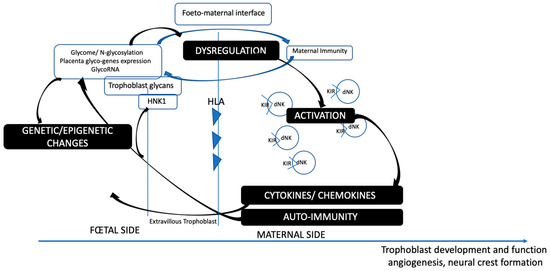 As a consequence, immune activation at the maternofetal interface (such as neurotoxins, infections, maternal autoimmunity, HLA haplotypes) may lead to immunogenic processes involving cytokines, lymphocytes, NK-specific activation, and the production of antibodies against specific placental and fetal epitopes, with the crucial involvement of placental glycosylation. These modifications have important consequences for transcription and genetic expression. Importantly, the HNK-1 reactive carbohydrate is known to be highly immunogenic. Indeed, monoclonal antibodies against various embryonic nervous system antigens are specifically found against the HNK1 carbohydrate. We can assume that immunogenic reactions may target the HNK1 antigen expression regulation present on the extra-villous trophoblast, the placental tissue directly contacting maternal cells (Figure 2).