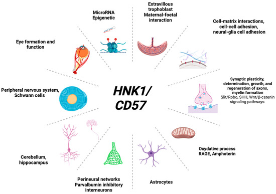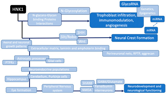 The glycosylation pathway is highly regulated during development, with the expression of sulfated glycoconjugates and, in particular, the carbohydrate HNK1 epitope. Expression of the HNK1 antigen during development is finely regulated, as it takes part in critical functions, such as cell–matrix interactions, cell–cell adhesion, neural-glia cell adhesion, spatial learning, memory, and synaptic plasticity, among others. The human natural killer-1 (HNK-1) epitope is a unique sulfated trisaccharide sequence presented on O- and N-glycans of various glycoproteins and glycolipids. HNK1 is present on O-mannosyl glycans, which are abundantly expressed in the brain. Its characteristic structural feature is a 3-sulfo-glucuronyl residue attached to lactosamine structures (Gal beta1-4GlcNAc) on glycoproteins and glycolipids. There are different HNK-1-specific antibodies described, anti-HNK-1/N-CAM (CD57), Cat-315 and M6749 (according to their affinity to the GlcA residues and sulfate groups of glycans HNK1), with essential functions of the sulfate group of HNK1 responsible for antibody recognition [3]. Glycans and galectins (β-galactoside-binding lectins) play a highly important role in neuronal fate [4]. Indeed, glycans and glycan-related proteins are involved in the determination, growth, and regeneration of axons, synaptic activity, myelin formation and glial cells expression. They also have huge functions in the functioning of the placenta, such as trophoblast infiltration, immunomodulation and angiogenesis [5].