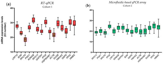 The evaluation of the potential stability in the expression levels of the 15 selected internal reference genes (IRGs) in two independent cohorts of periprostatic adipose tissue (PPAT) samples [i.e., analysis of all samples together from cohort 1 and all samples from cohort 2; Table 1] revealed that the top five IRGs with higher stability (based on changes in the Standard Deviation [SD]) using the RT-qPCR method were LRP10 (27.99 ± 1.47), B2M (23.11 ± 1.50), RPLP0 (25.97 ± 1.71), PGK1 (26.64 ± 1.76), and KDM2B (31.66 ± 1.78) (Figure 1a; expression levels expressed as SD of Cycle threshold [Ct] values). Statistics details for all IRGs are summarized in Table S1. Similarly, the top five IRGs with the higher stability using the microfluidic-based qPCR array method were RPS13 (19.21 ± 1.91), PGK1 (20.19 ± 1.99), RPLP0 (18.42 ± 2.01), IPO8 (25.01 ± 2.02), and LRP10 (19.84 ± 2.17) [Figure 1b (expression levels expressed as SD of Ct values) and Table S1)]. It should be mentioned that the use of the SD of the Ct value in these types of analyses/representations is widely used as a first approach since this offers a more visual and direct comparison of the genes by placing them over a narrow dynamic range of values [13,14,17]. In this regard, a representation of the linearized values of the Ct of each of the 15 IRGs (expressed in absolute mRNA copy number) for both techniques used (RT-qPCR and microfluidic-based qPCR array) are also represented in Figure S1, showing similar results. For this latter purpose, standard curves for each selected gene were run in parallel to quantify the absolute mRNA copy number across all the samples analyzed.